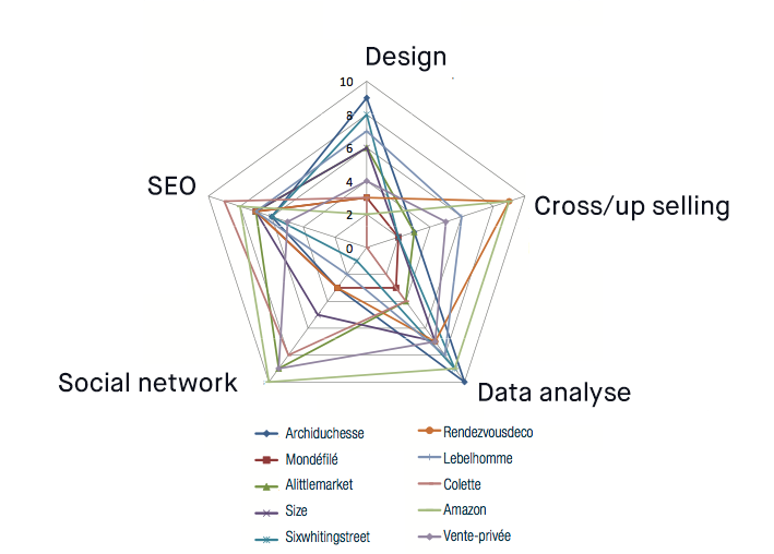 We started by comparing the digital strategies of 10 e-commerce websites. We analysed and classified them based on the importance of these 5 characteristics : Design, Cross-up selling, Data analysis, Social network and SEO.
